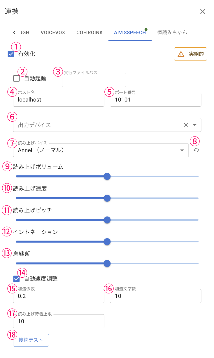 | ⑱接続テスト | 読み上げ接続テストを実行 |