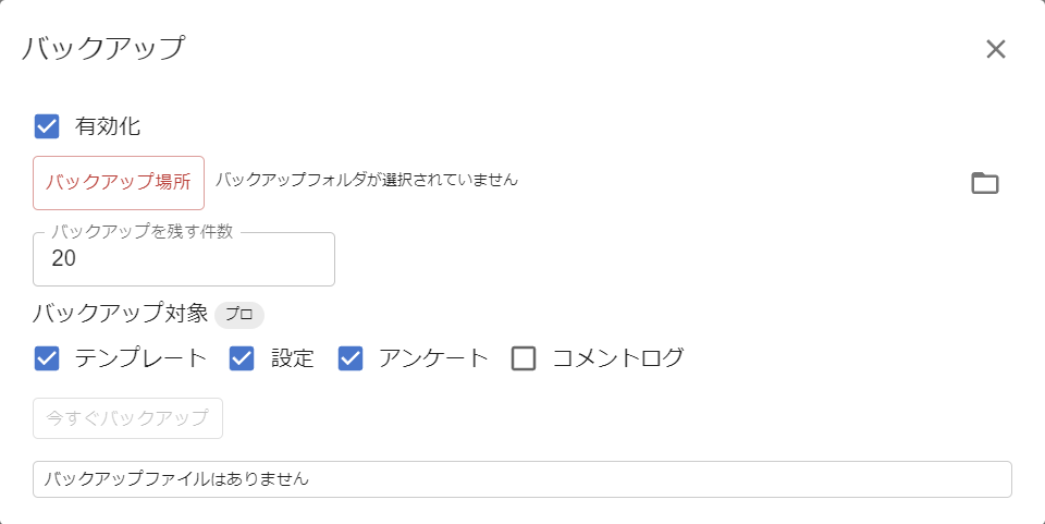 | 有効化 | 自動バックアップを有効化します (注意:バックアップ場所の指定が必須です) |