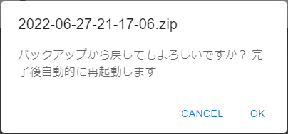 | (時計に反時計回りの矢印のアイコン) | バックアップファイルの右側に表示されています クリックすることで対象のバックアップファイルから復元を開始します |