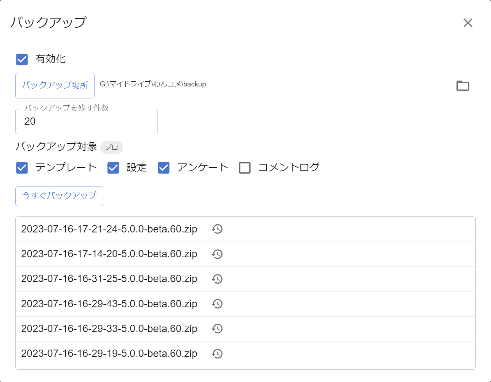 | 今すぐバックアップ | 自動バックアップを待たずにその場でバックアップファイルを作成できます |