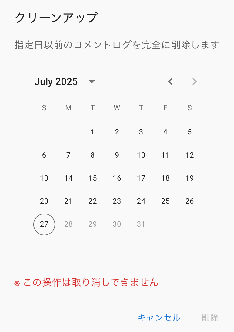 削除基準とする日付を選択し、削除をすると選択した日以前のコメントログが削除されます