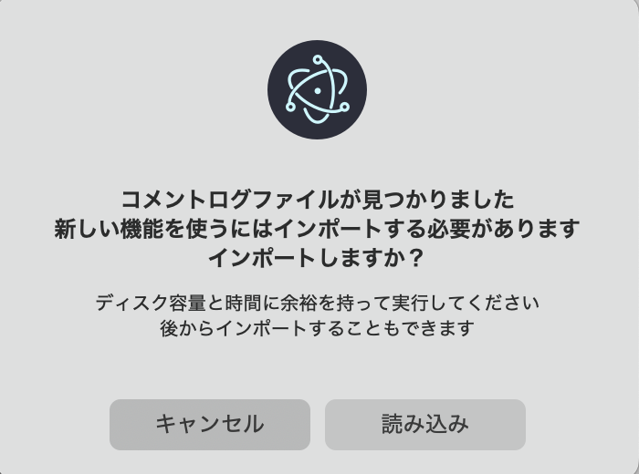 わんコメの右上メニュー > コメントログ > 旧ファイルをインポートを選択します
