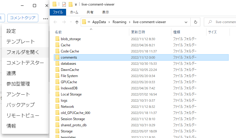 ※commentsディレクトリは、メニューの「フォルダを開く」の階層から確認できます。