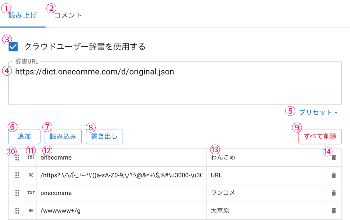 | ⑤プリセット | わんコメが提供している辞書の中から追加できます ※ 日英辞書は単語数が多いため負荷にご注意ください |