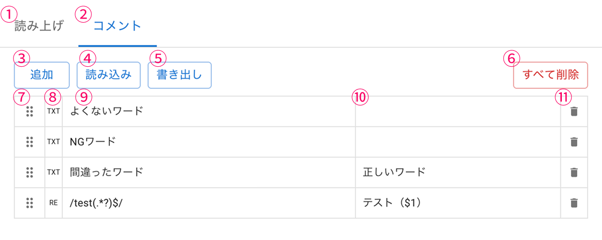 | ①読み上げタブ | 読み上げ辞書設定を表示します |