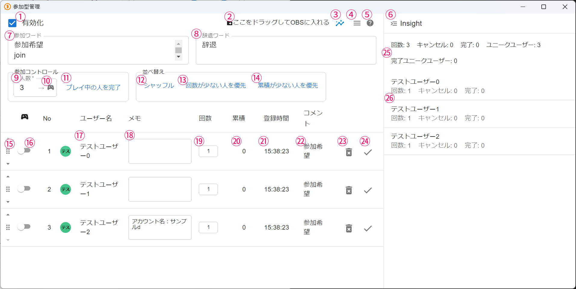 ㉖insight(個別)参加希望をしたユーザーごとの参加状況です