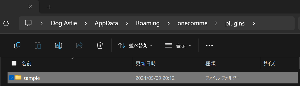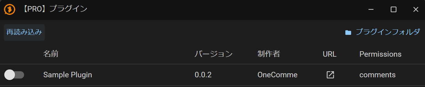 C:\\Users\\\{YOUR_ID\\AppData\\Roaming\\onecomme\\plugins\\sample\\plugin.js のようにplugins/プラグインフォルダ名/の下にplugin.jsがある状態にしてください)
