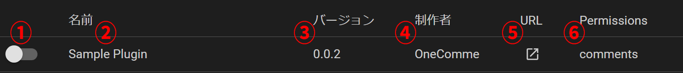 ①有効化プラグインの有効・無効を切り替えます