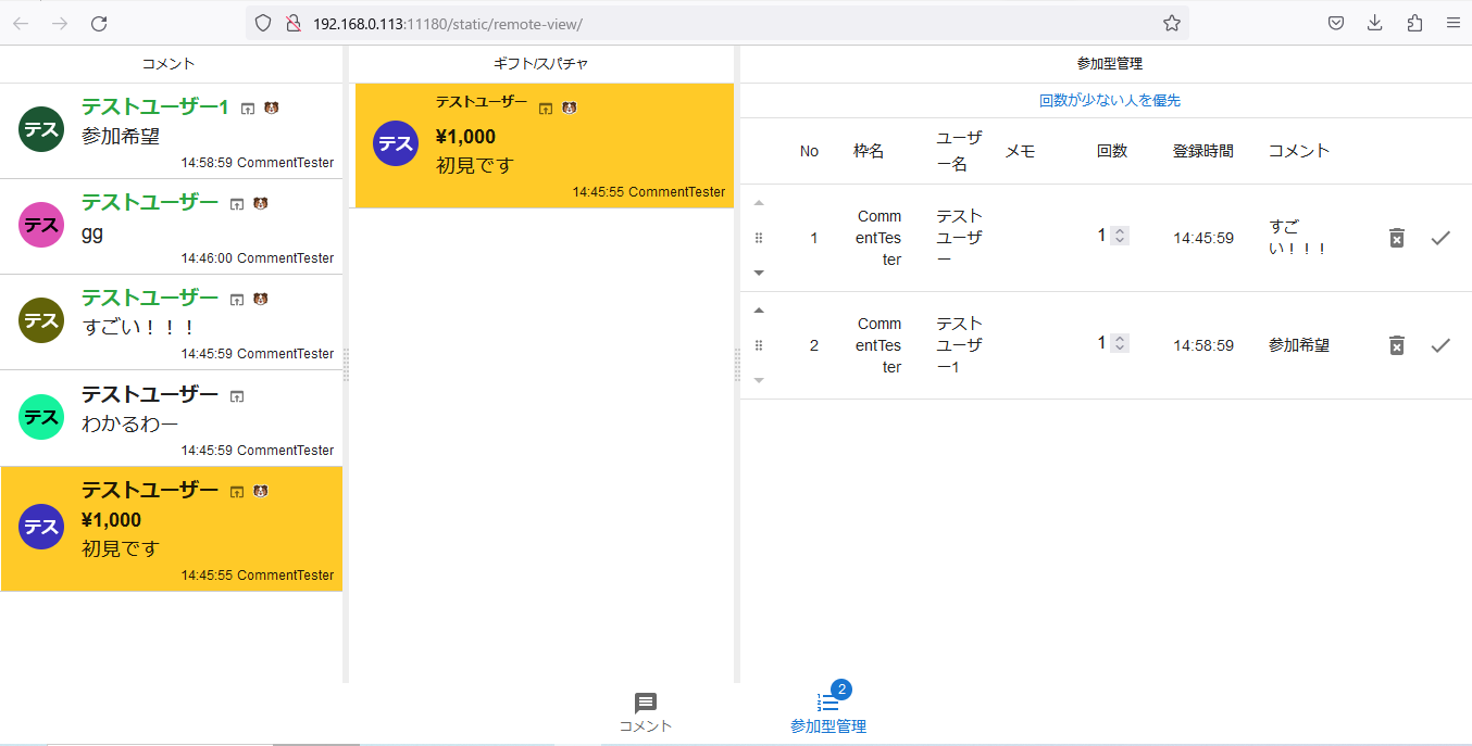 リモートビューはわんコメアプリで取得したコメントを同一ネットワーク上にある他のデバイスでも閲覧や操作ができる機能です参加型管理が有効な場合ブラウザー上で同じ操作が可能です