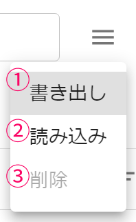 | ⑨データベース操作メニュー | データベースへの操作(書き出し・読み込み・削除)メニューを開きます |