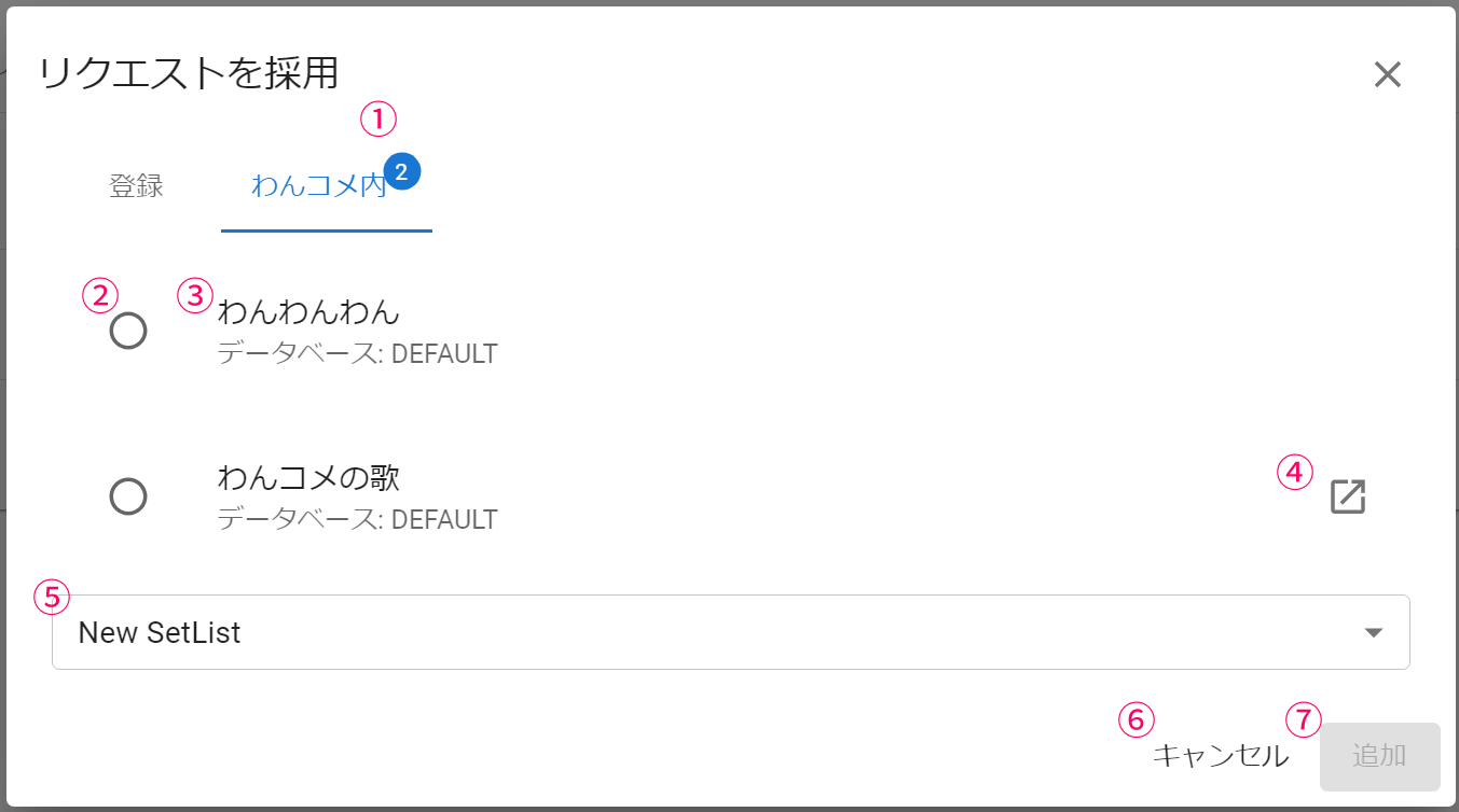 | ②わんコメ内 | リクエストされた曲を曲データベースの中から探したいときに選択します |