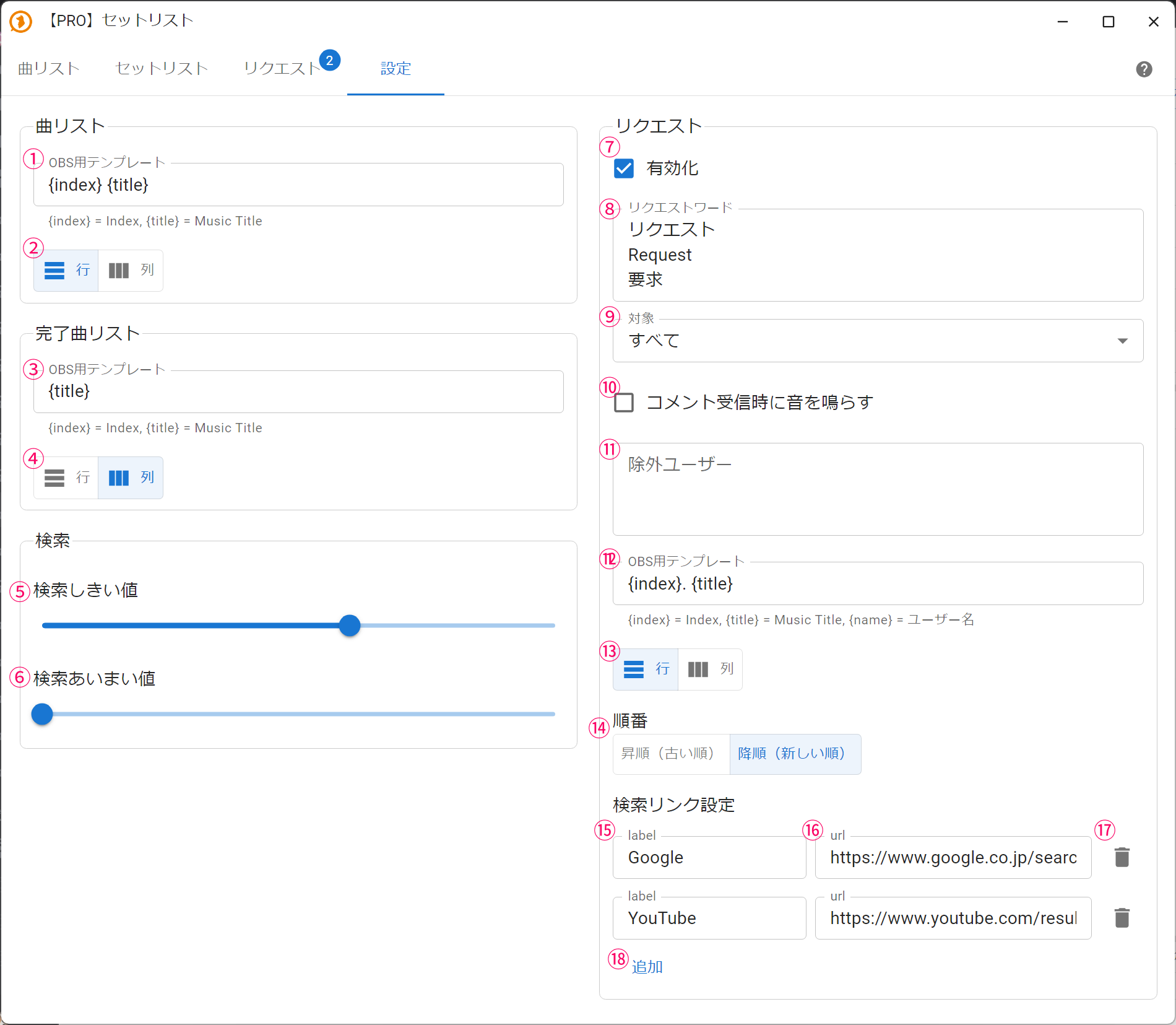 | ⑫セットリストテンプレート | 配信ソフトにドラッグ&ドロップすることで配信ソフトにセットリストの曲一覧を追加します |