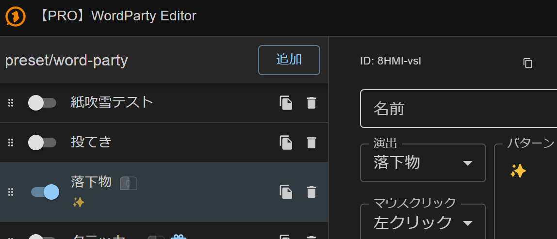 WordPartyエディタの演出編集を開くとIDが表示されています (画像右上の8桁英数記号)