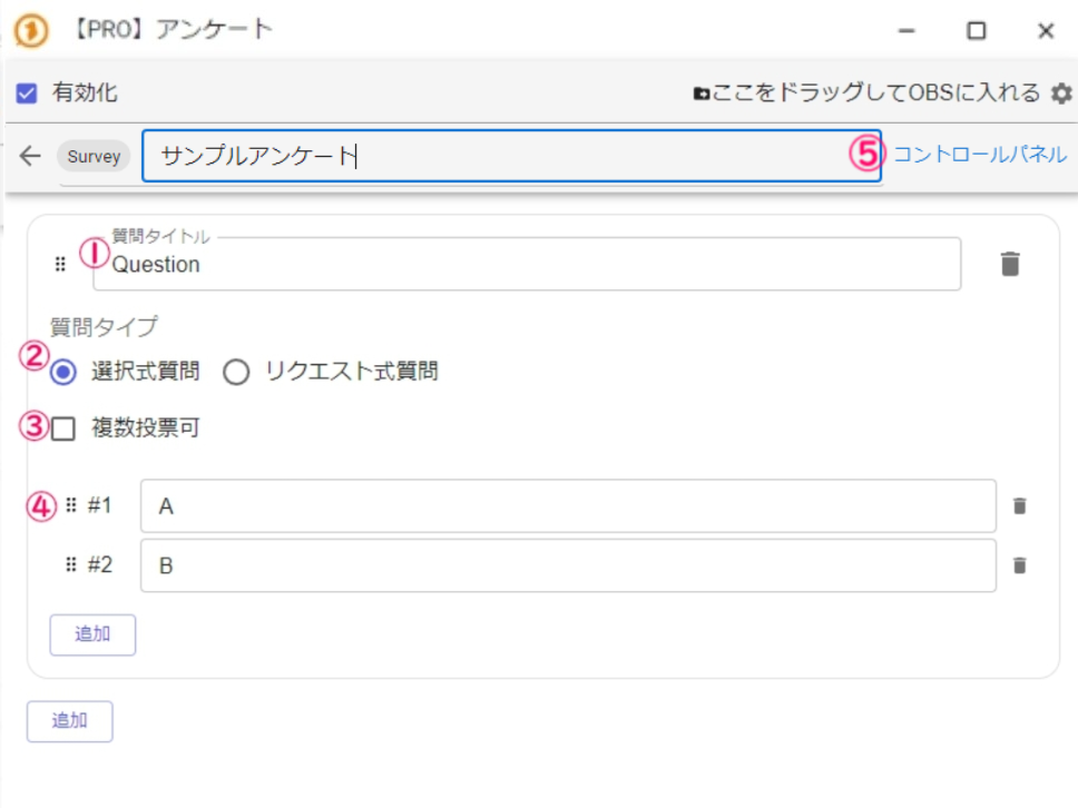 ④選択肢を入力します#1, #2と自動で振られる連番をリスナーがコメントすると投票される仕組みです。追加等をして選択肢を完成させます