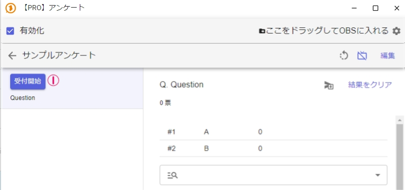 アンケートの回答を受け付けるためには①の受付開始ボタンをクリックします