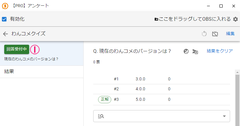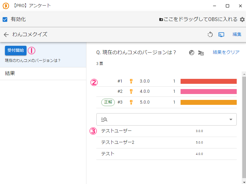 回答受付中の状態で「#1」とコメントされると下図のように#1の選択肢に投票され、投票順にリスナー名が回答先とともに一覧表示されます