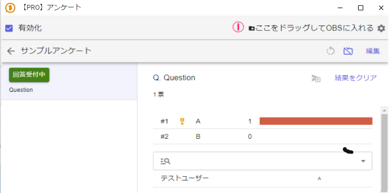 回答受付中の状態になると下図のように質問タイトルと選択肢、投票状況などが表示されます(図では選択式質問)