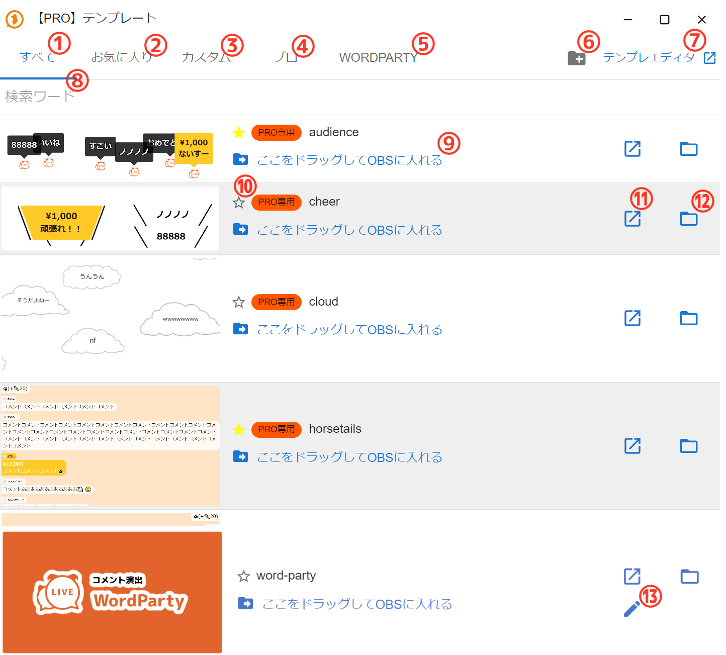⑬ 🖊アイコン(WordPartyテンプレートのみ)このWordPartyテンプレートの編集画面を開きます