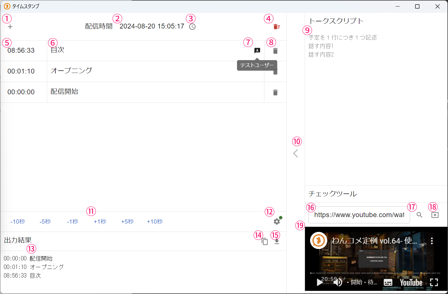 | ⑯チェックツールURL | YouTubeのアーカイブURLを入力するとプレビュー欄で再生できます 再生状態でタイムラインを選択すると自動的にジャンプして位置を確認できます |