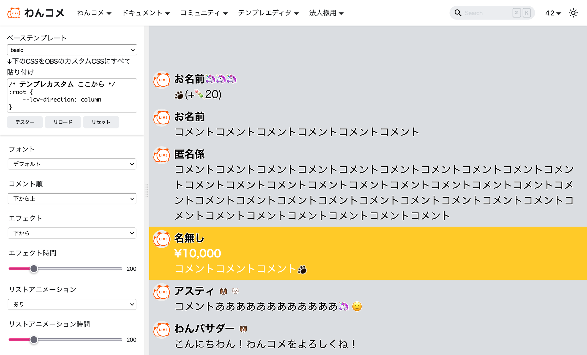 シミュレートするサービスやギフトの有無など設定し、ユーザー名・コメントを入力して送信すると、テンプレートプレビューにコメントが追加されます(コメントを空で送信するとランダムなコメントが追加されます)