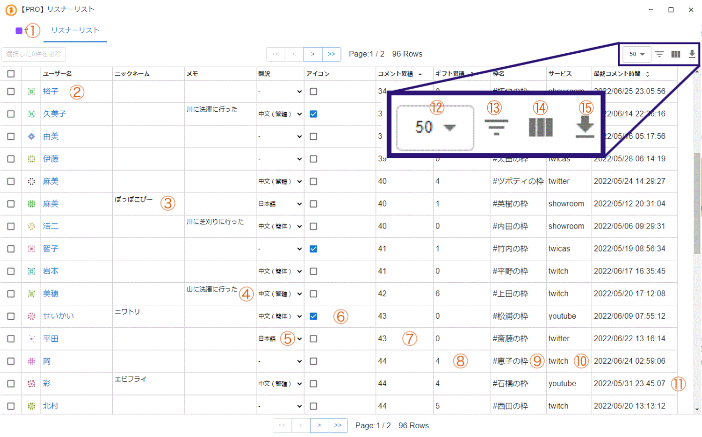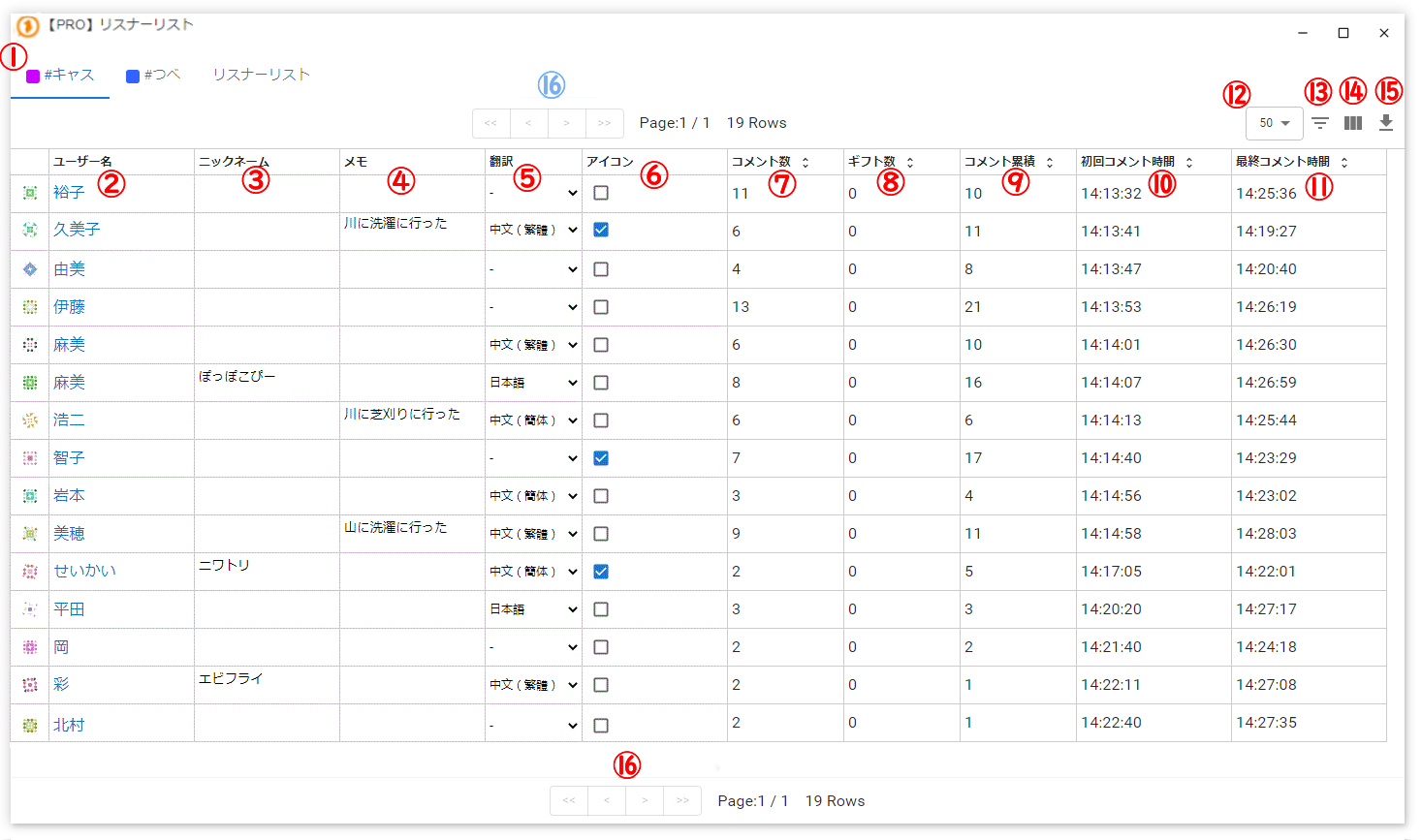 | ⑮⇩(DLマーク) | リスナーリストをCSVで出力することができます |