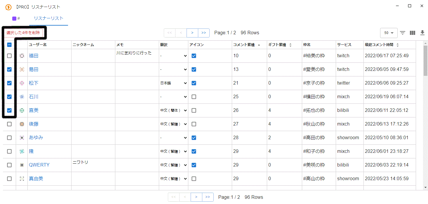 枠設定で「リスナー記録」されたリスナーの一覧です