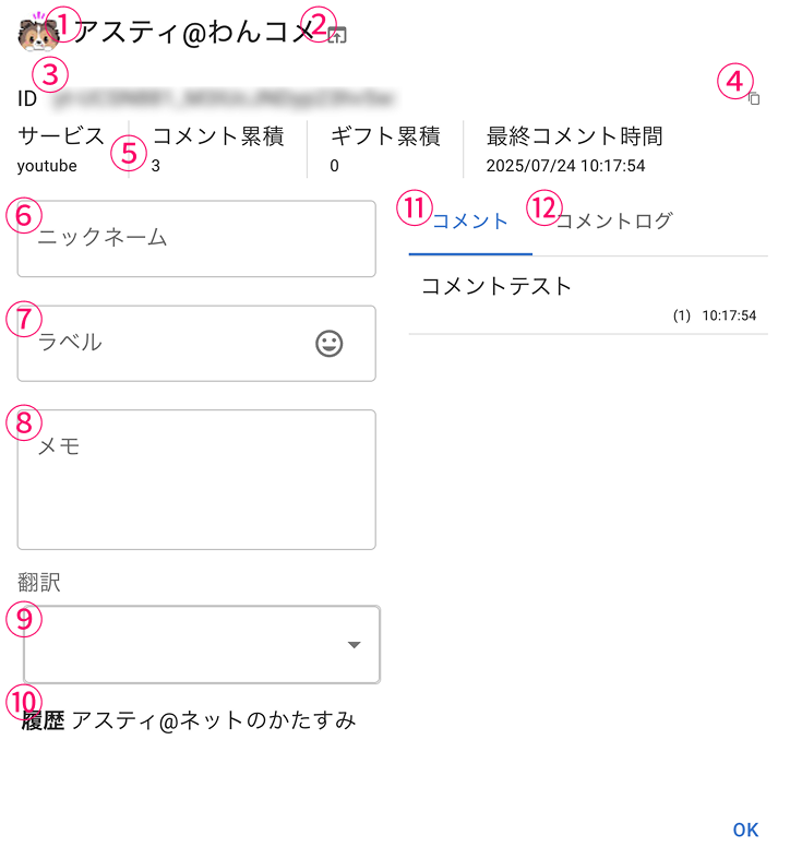 | ③リスナーID | わんコメ内での固有のIDです ブロックや読み上げ除外する際に使用します |