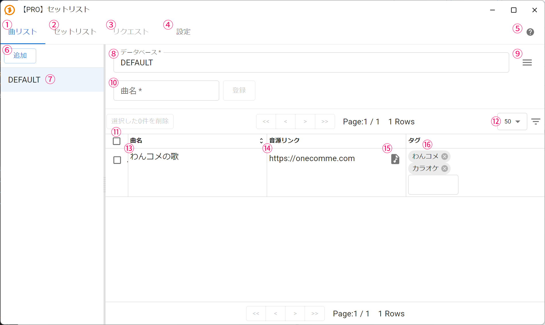 | ①曲リスト | 曲データベース管理画面を表示します |