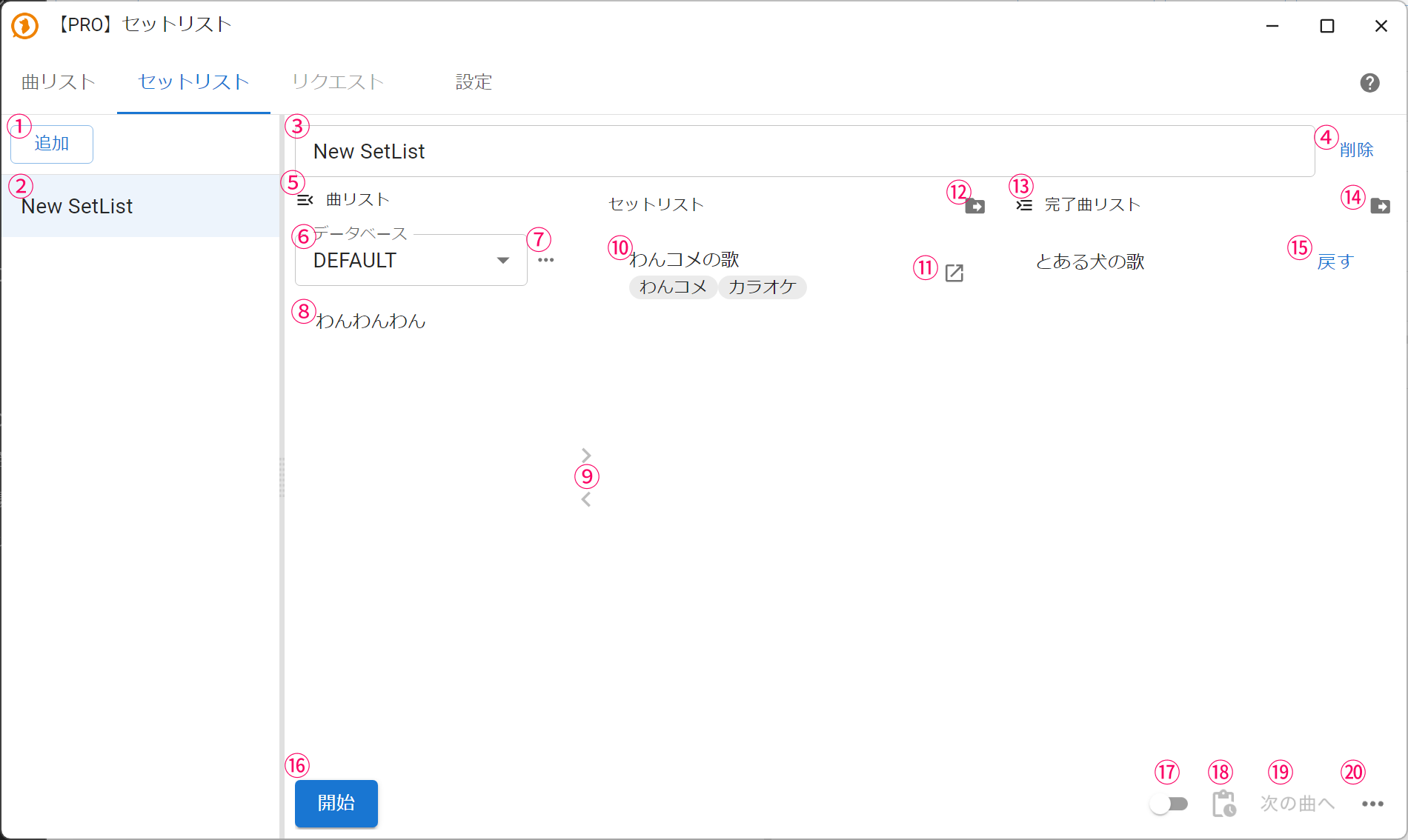 | ⑯開始 | セットリストを開始します 開始することでセットリストの曲を次へ 次へと切り替えできるようになります |