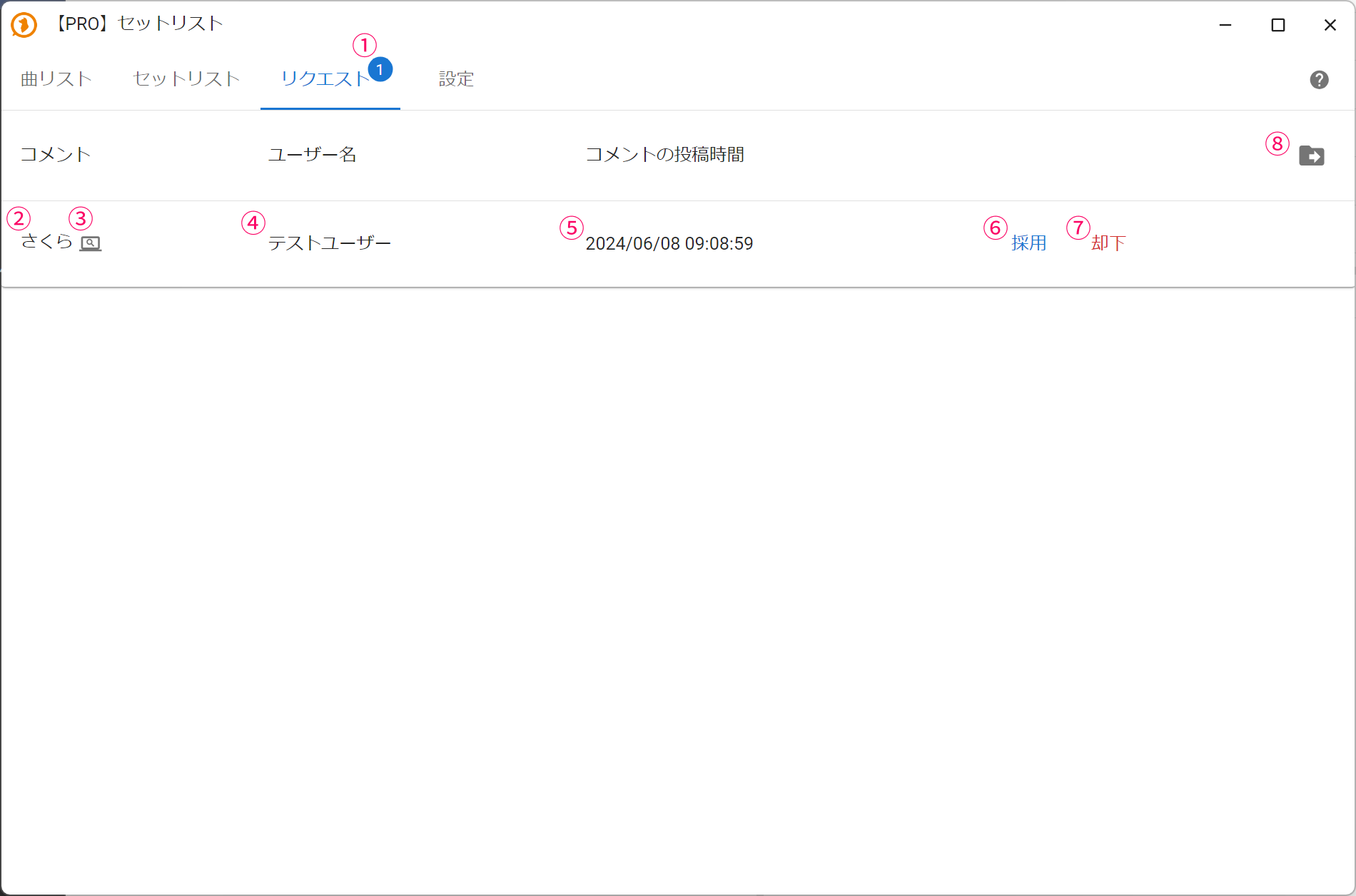 | ①登録 | リクエストされた曲を新規に登録する際に選択します |