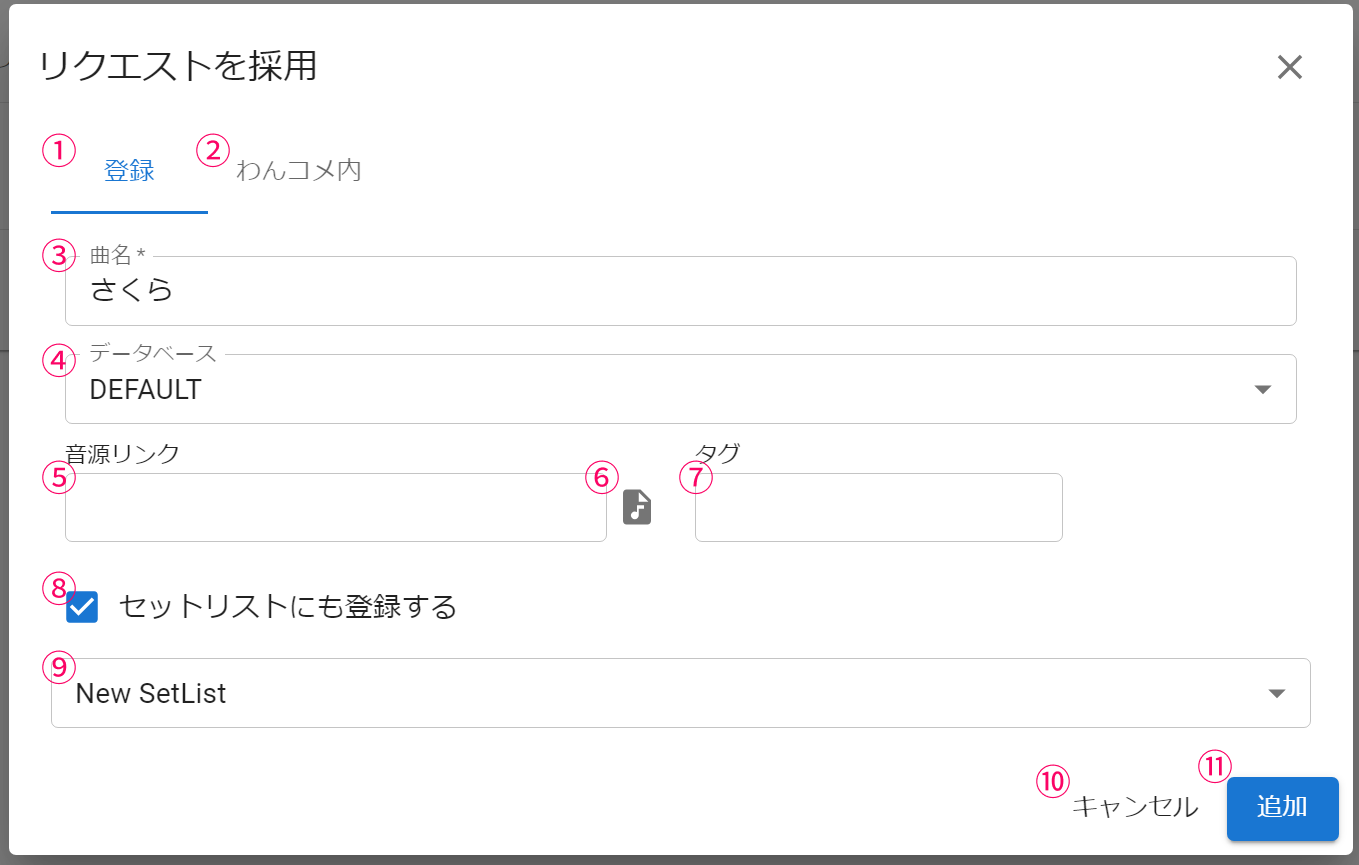 | ⑧セットリストにも登録する | 曲の登録と同時にセットリストに曲を追加します |